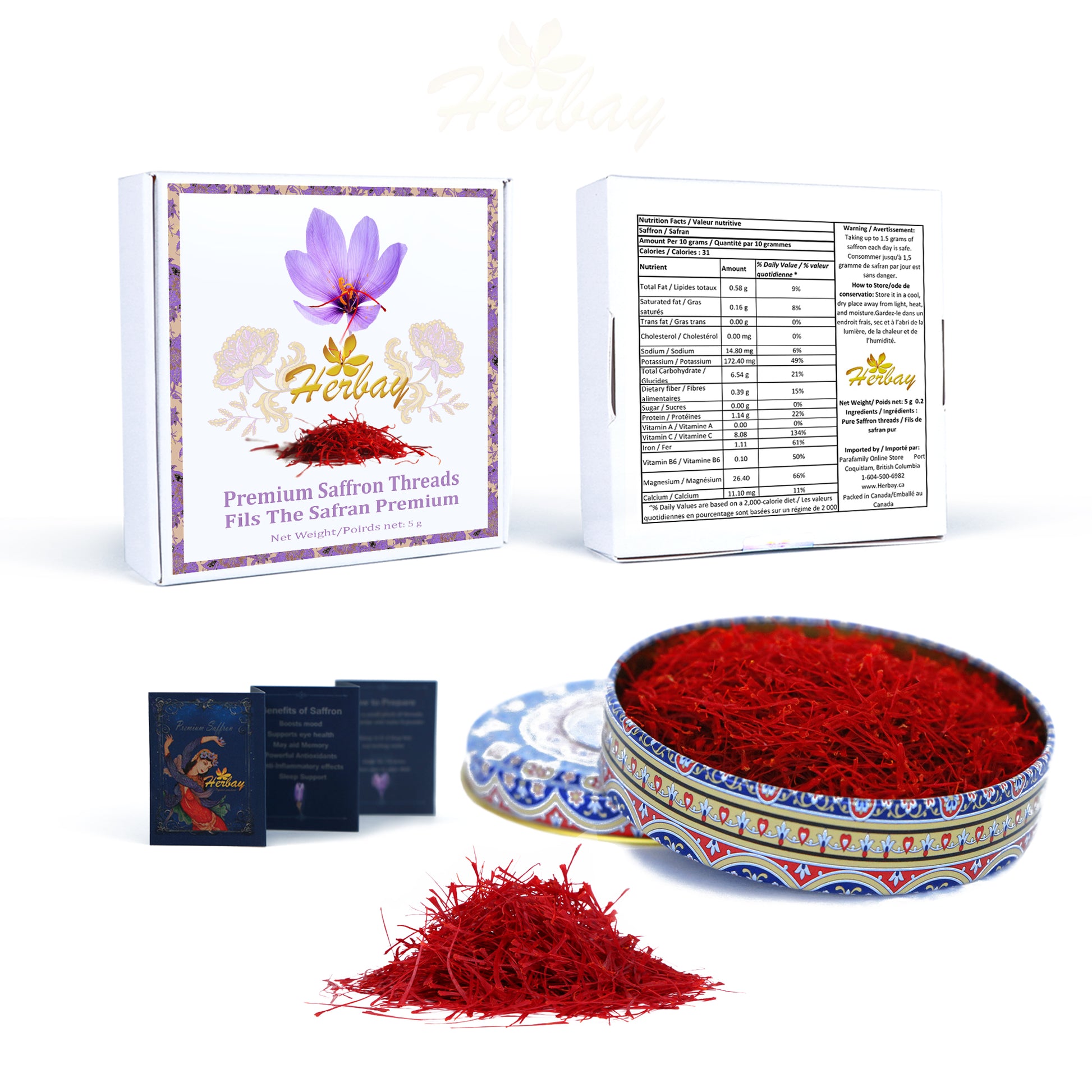 Details: Herbay Premium Saffron contains %100 All Red Super-Negin Rare Threads, known as the best quality saffron in the world. It's All About Freshness! We Fresh harvest, process, and pack in air-tight tin containers and express airship to the United States for maximum freshness and to offer the highest quality in terms of colour and aroma in the market. In each Package of Herbay Premium Saffron, you will find 5 grams of Grade A, All Red Natural, Fresh Saffron Threads without any yellow styles.